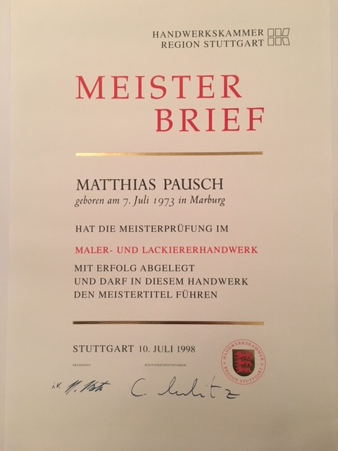 Matthias Pausch legte im Jahr 2000 den kaufmännischen Abschluß zum Betriebswirt des Handwerks ab, um das Malerunternehmen nachhaltig, eigenständig und verantwortlich zu führen.